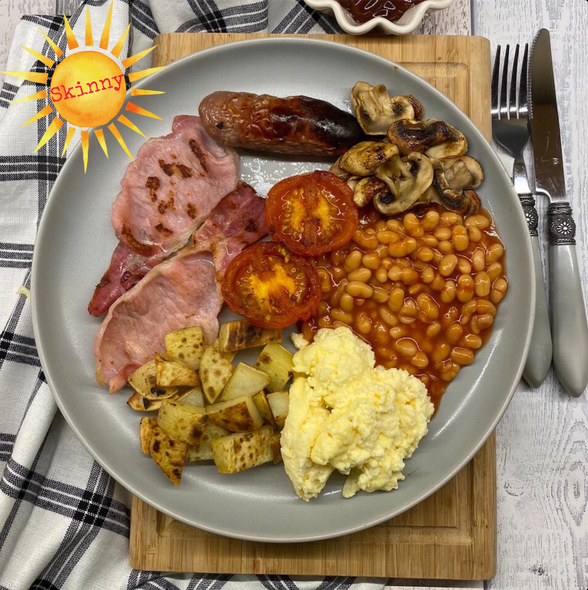 Grilled bacon, sausages & tomatoes. Mushrooms cooked with cooking spray, served with beans & scrambled eggs.