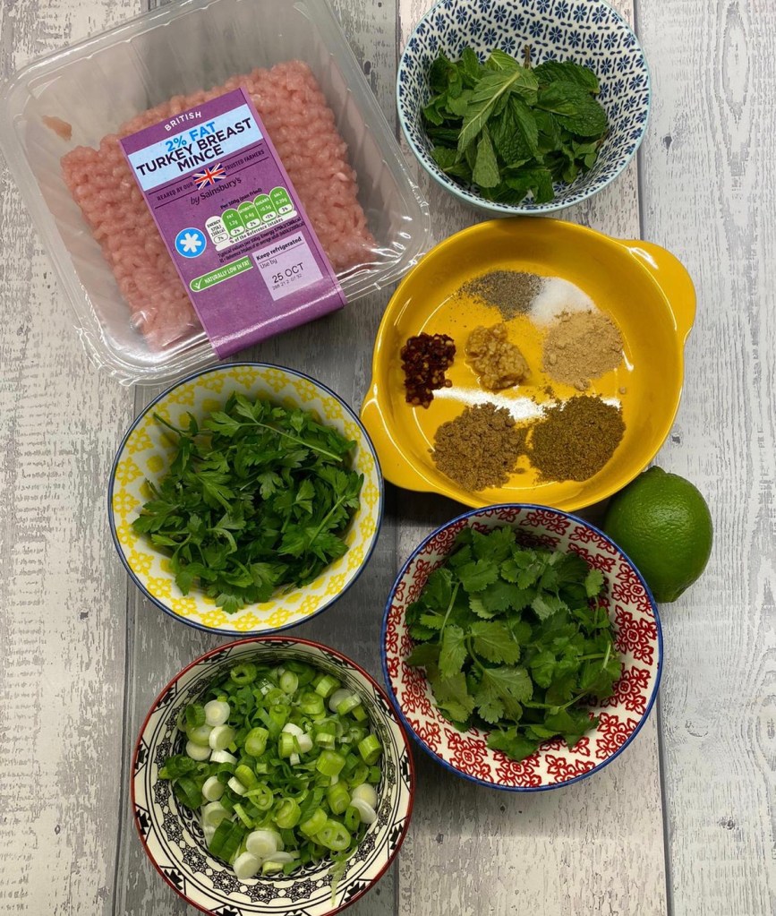 Place the spring onions, garlic, chilli, turkey mince, ground spices and chopped herbs in a mixing bowl. Season with salt and black pepper. Using your fingers, mix thoroughly. Cover and chill for 3 – 4 hours.