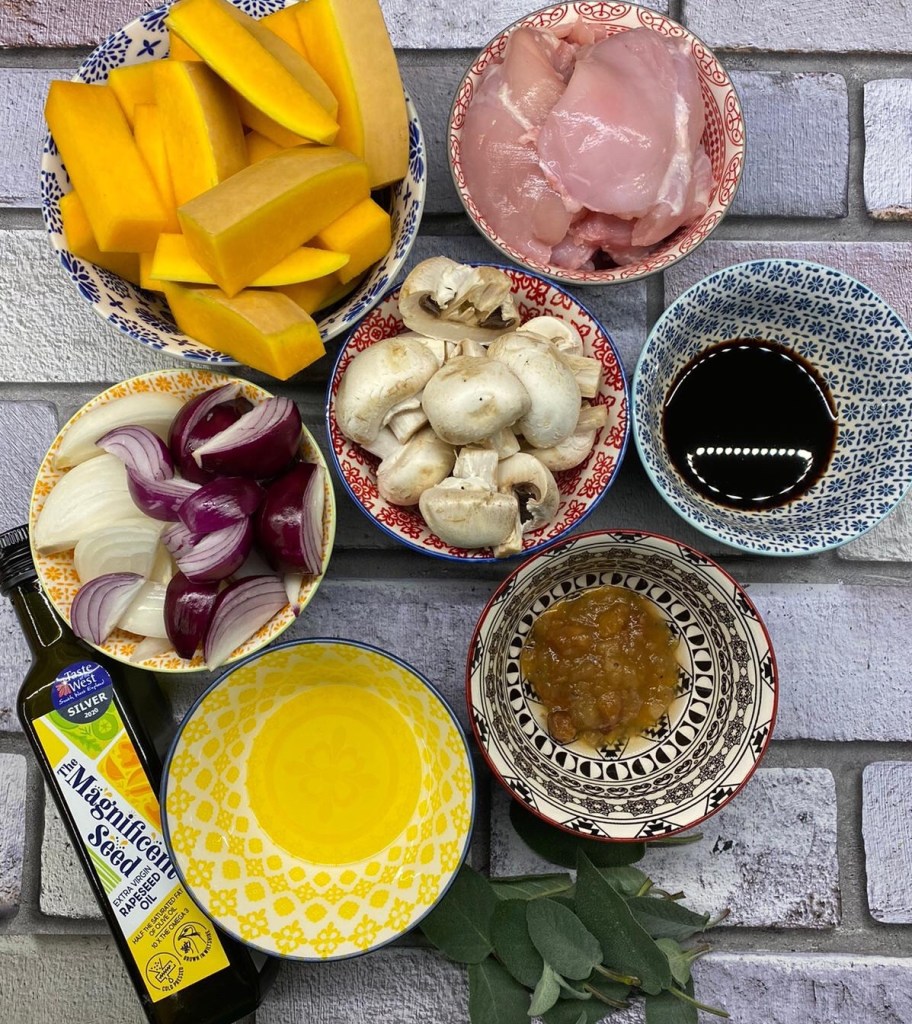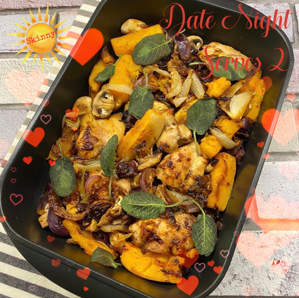 Succulent tender chicken thighs, colourful butternut squash, onions and mushrooms all baked together in the oven then drizzled with chutney and vinegar sauce and garnished with crispy sage leaves. For a veggie version use goats cheese instead of chicken.