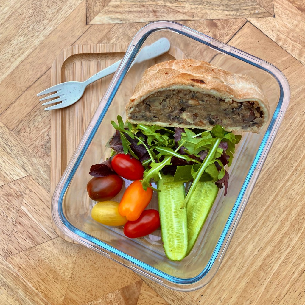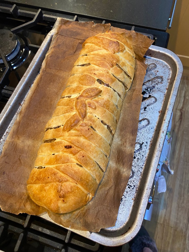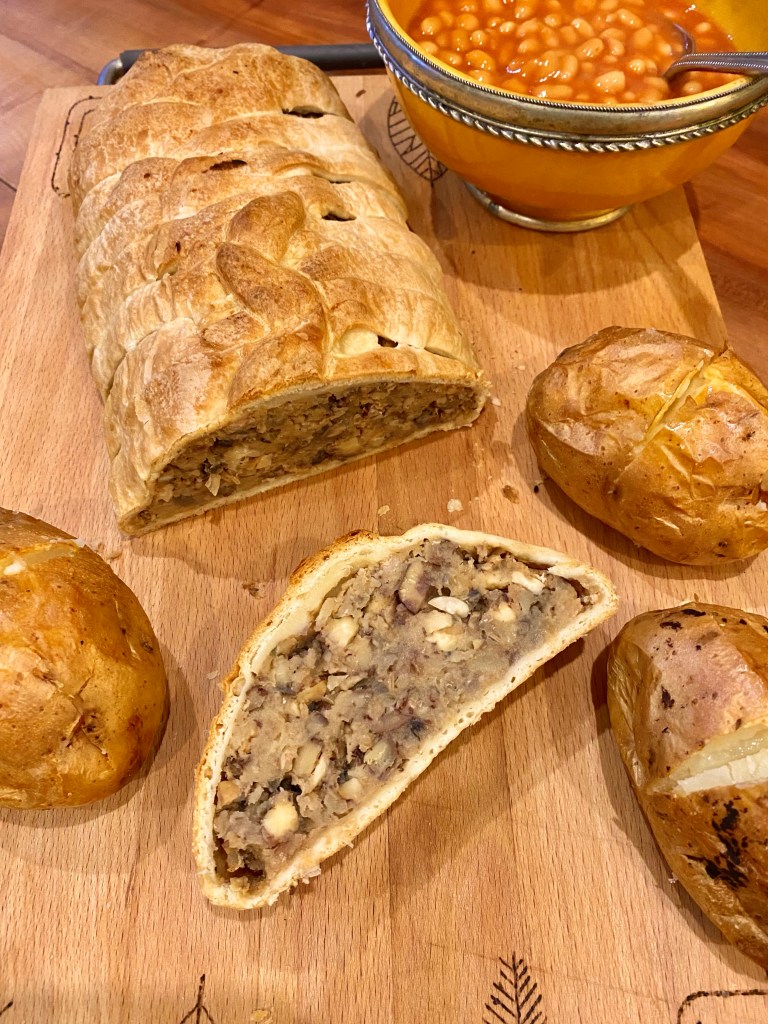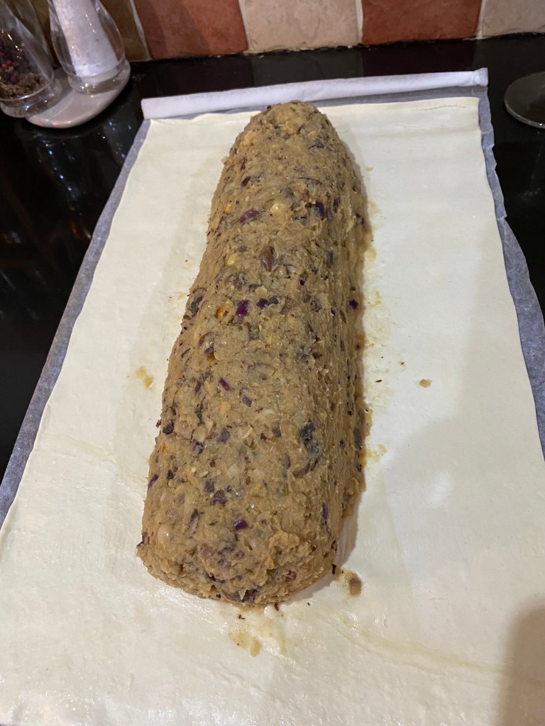 Wrap the pastry over the mixture like a sausage roll or cut inch wide strips either side to ‘plait’ over the top. (Sorry, lost the photo for the plaited one 😩).