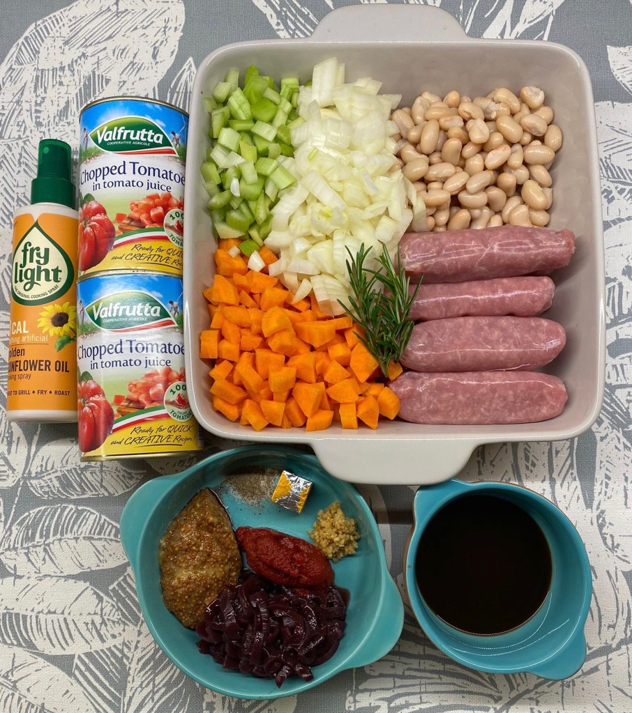 A healthy and filling supper dish with lean sausages, tomatoes, beans, and vegetables.