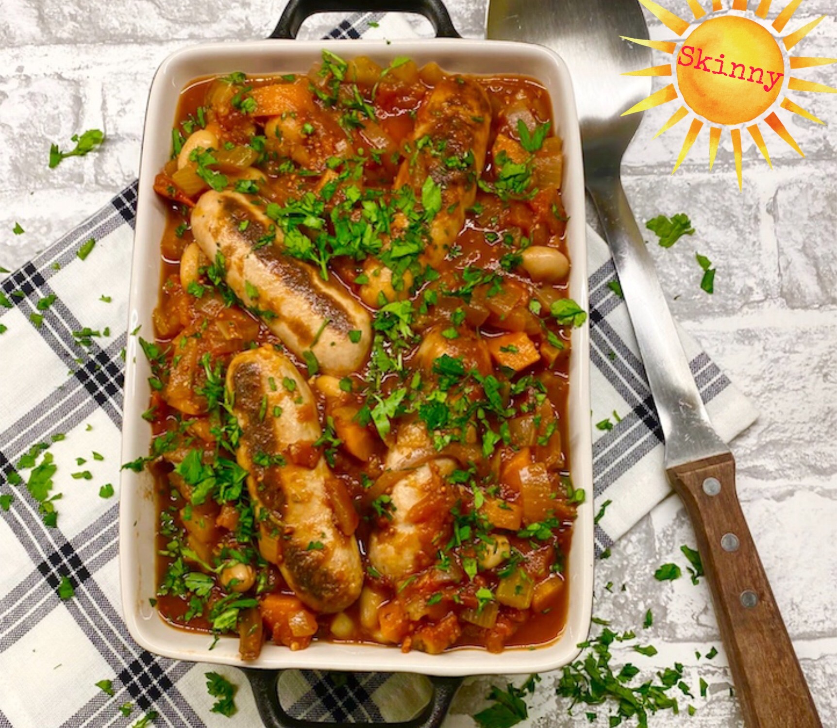Place the sausages onto top of the vegetable and bean mixture and place in the oven to bake for 20 minutes. Remove from the oven gently stir everything together and return to the oven for a further 20 minutes. Sprinkle with fresh parsley.