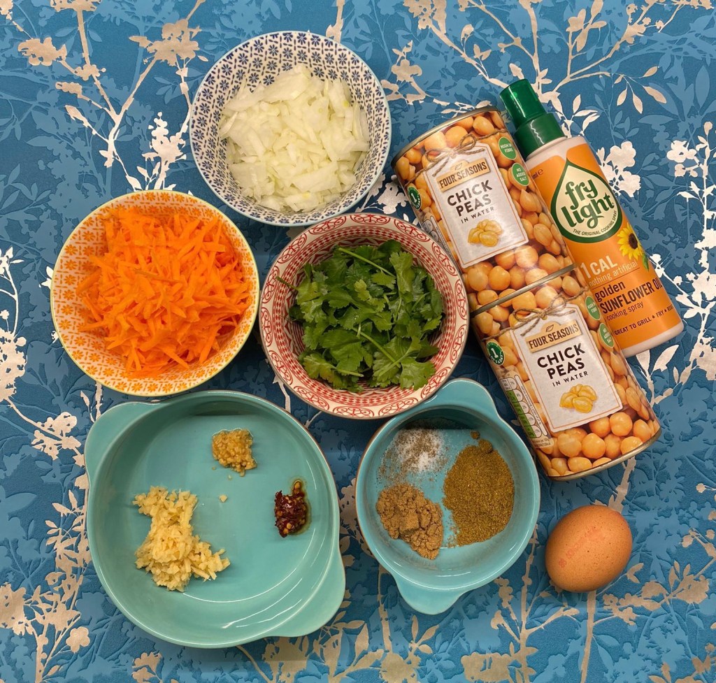 Place the onion, carrot, chickpeas, garlic, ginger, cumin, chilli, ground, and fresh coriander into a food processor.