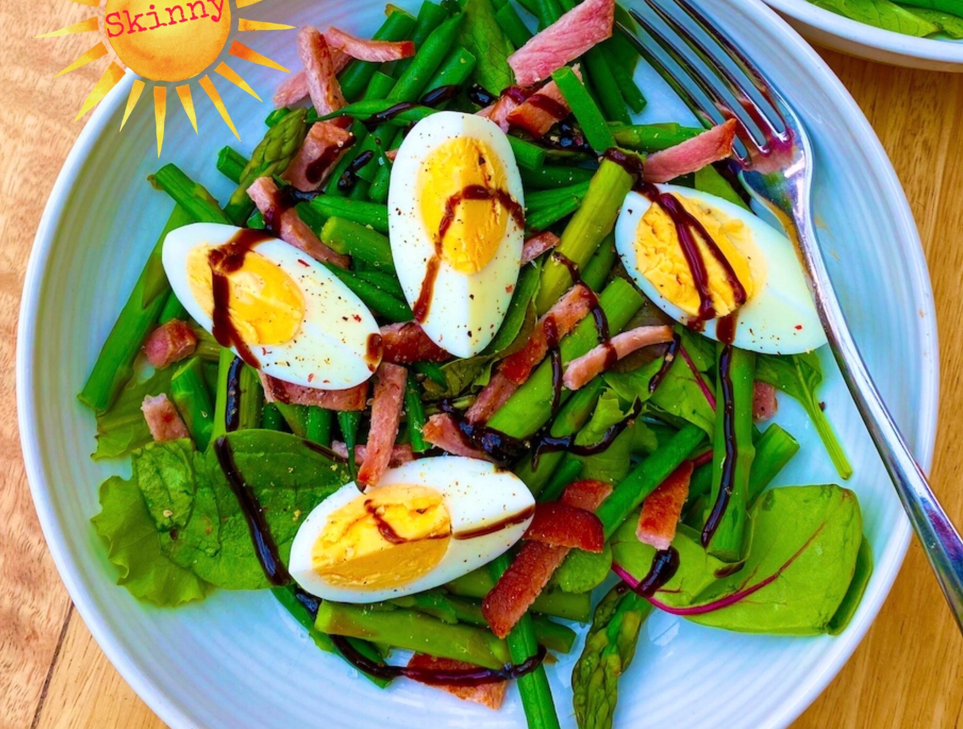 Top the salad leaves with the vegetable bacon mix, drizzle with the balsamic dressing, and top with the eggs and a good grind of black pepper.