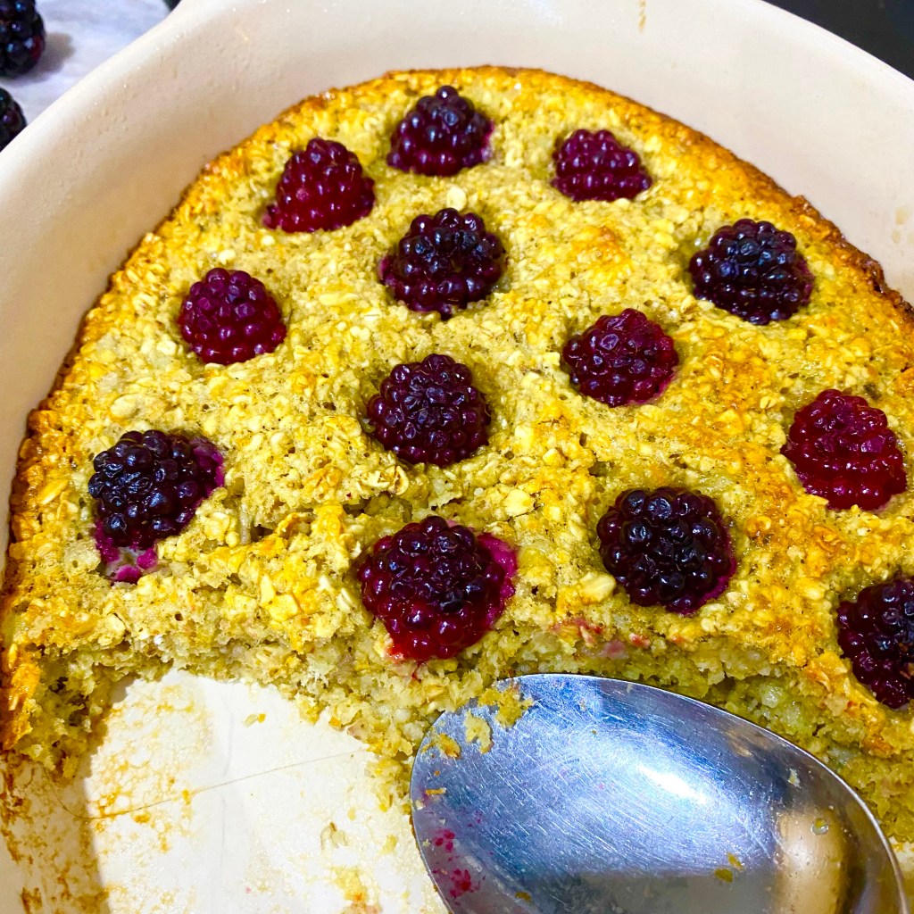 Arrange the blackberries on top, pushing them lightly into the mix. Don’t worry if you don’t use all the blackberries, serve any left over with the baked oats.