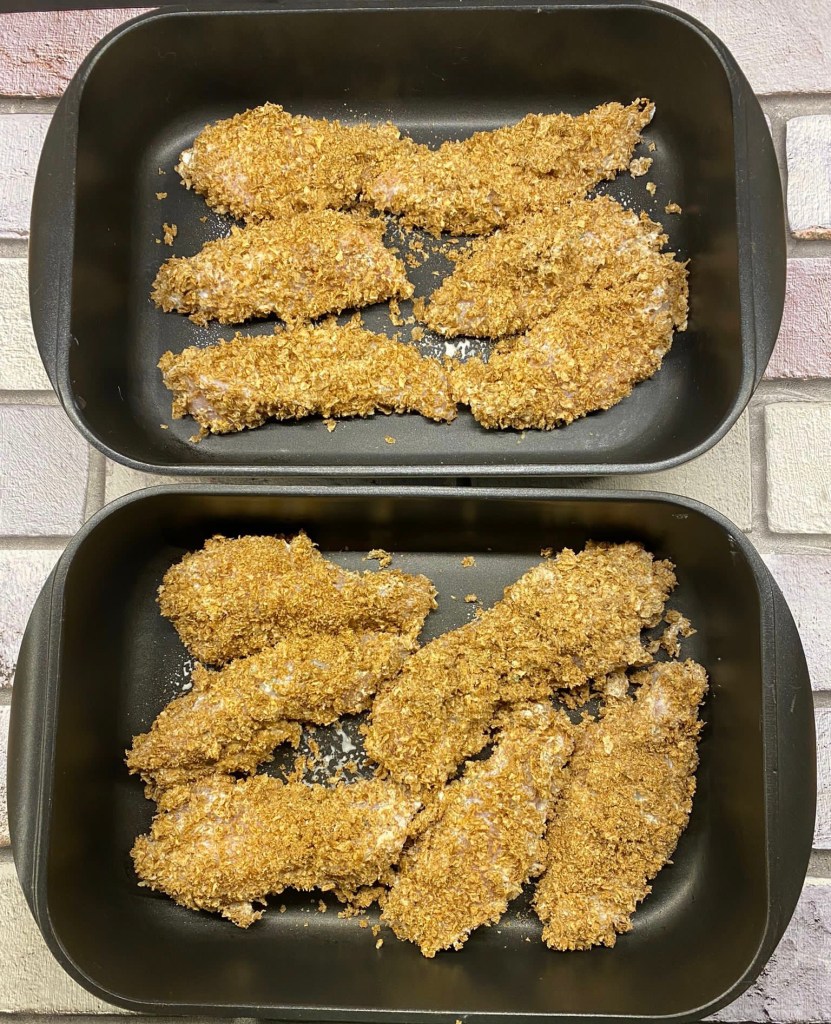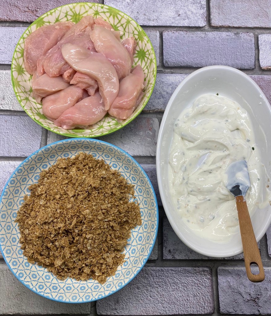 Tender strips of chicken breasts covered in fat – free natural yogurt, garlic, fresh thyme then generously coated in crushed up Weetabix then baked in the oven until golden and crispy.