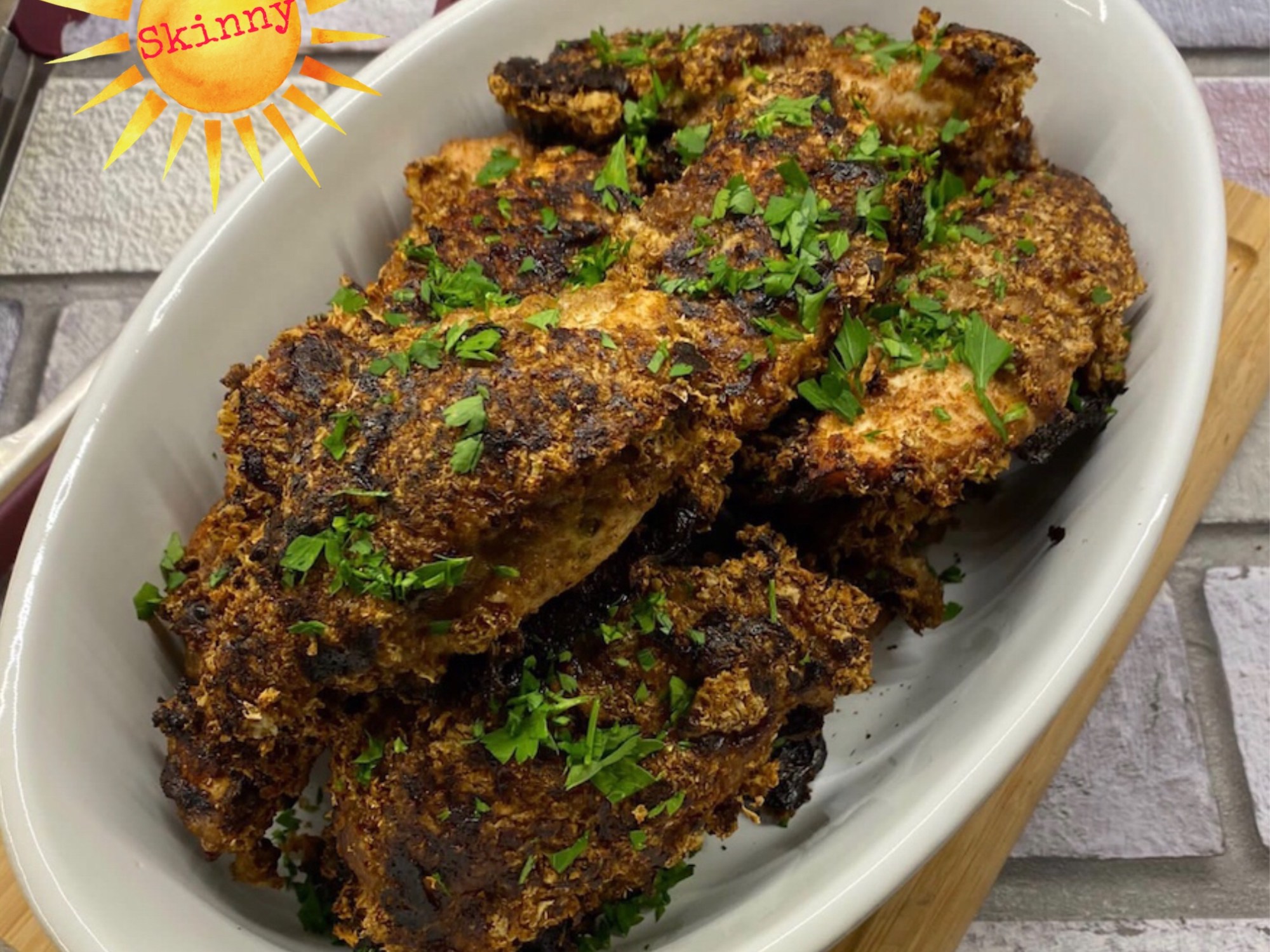 Tender strips of chicken breasts covered in fat – free natural yogurt, garlic, fresh thyme then generously coated in crushed up Weetabix then baked in the oven until golden and crispy.