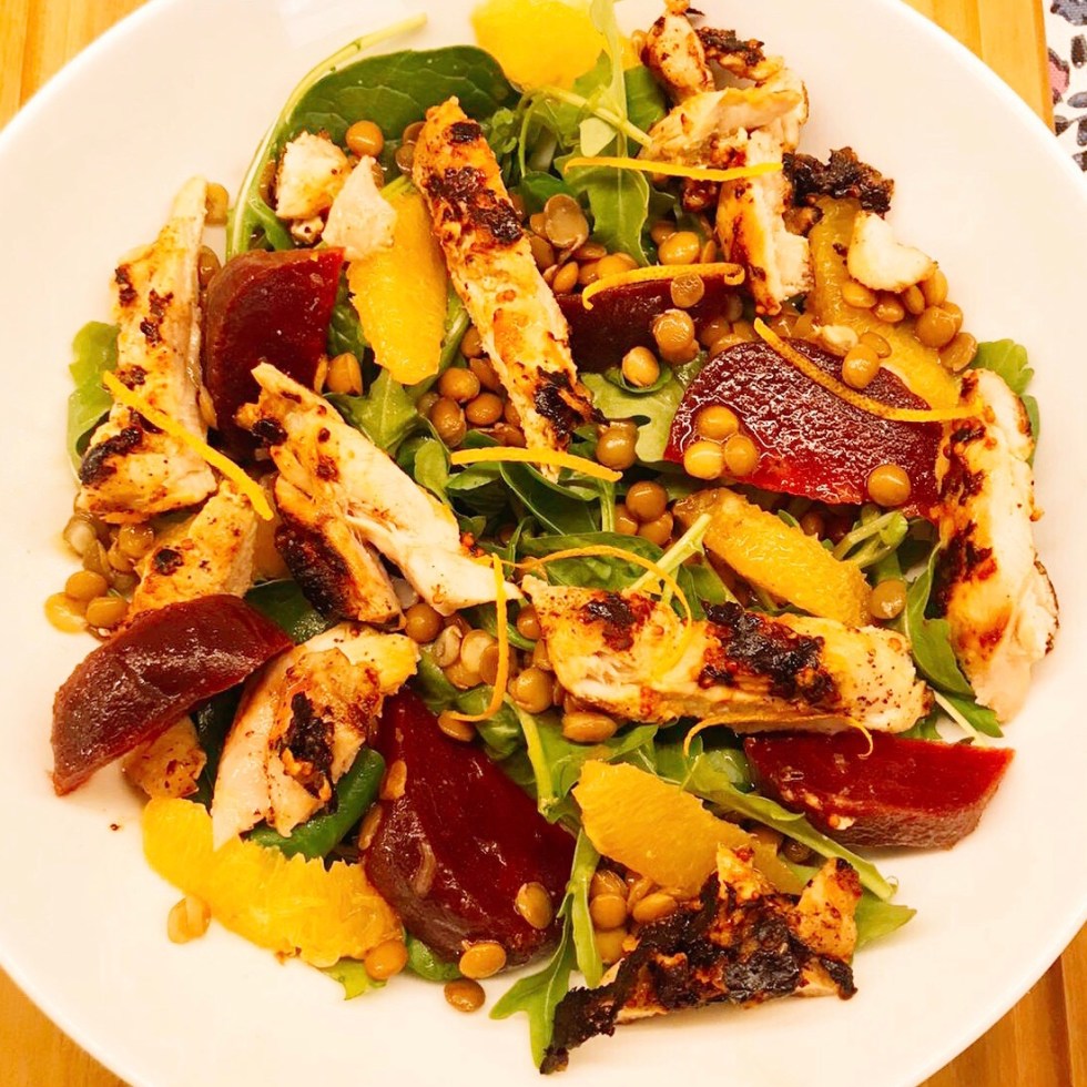 Mustard Chicken Lentil, Beetroot and Orange Salad